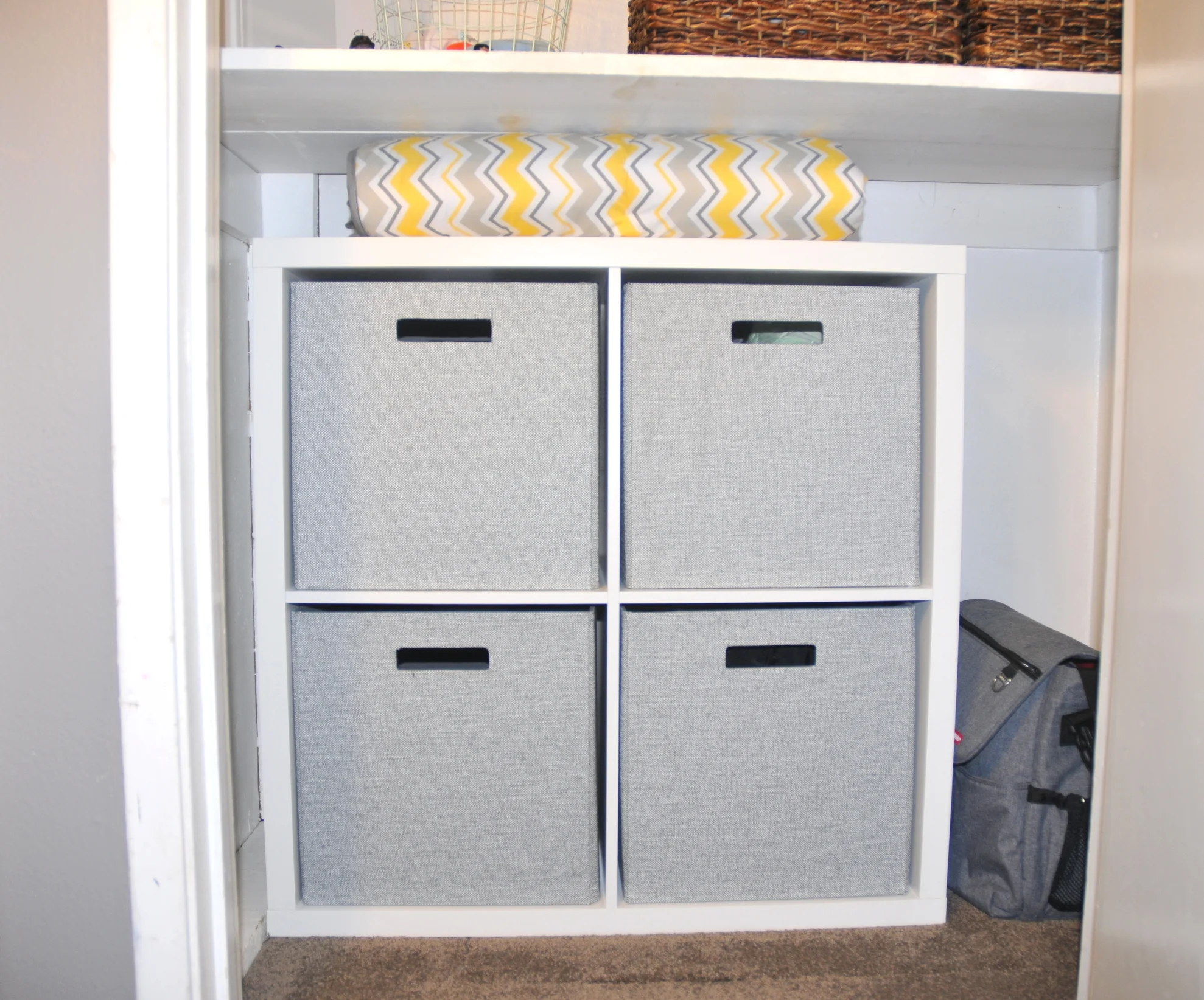 Next I wanted efficiency in the use of space in the lower closet. I found this 4 cube organizer at Target and put it together in 20 minutes. The fabric bins offer a touch of sophistication. The great thing about these bins is that as his needs change over the years what goes in the bins can easily change. Right now I put all of his extra blankets in one bin, the 9 month clothes in another, 12 month clothes in the 3rd bin and I left the last bin empty for the family to add to over time.
