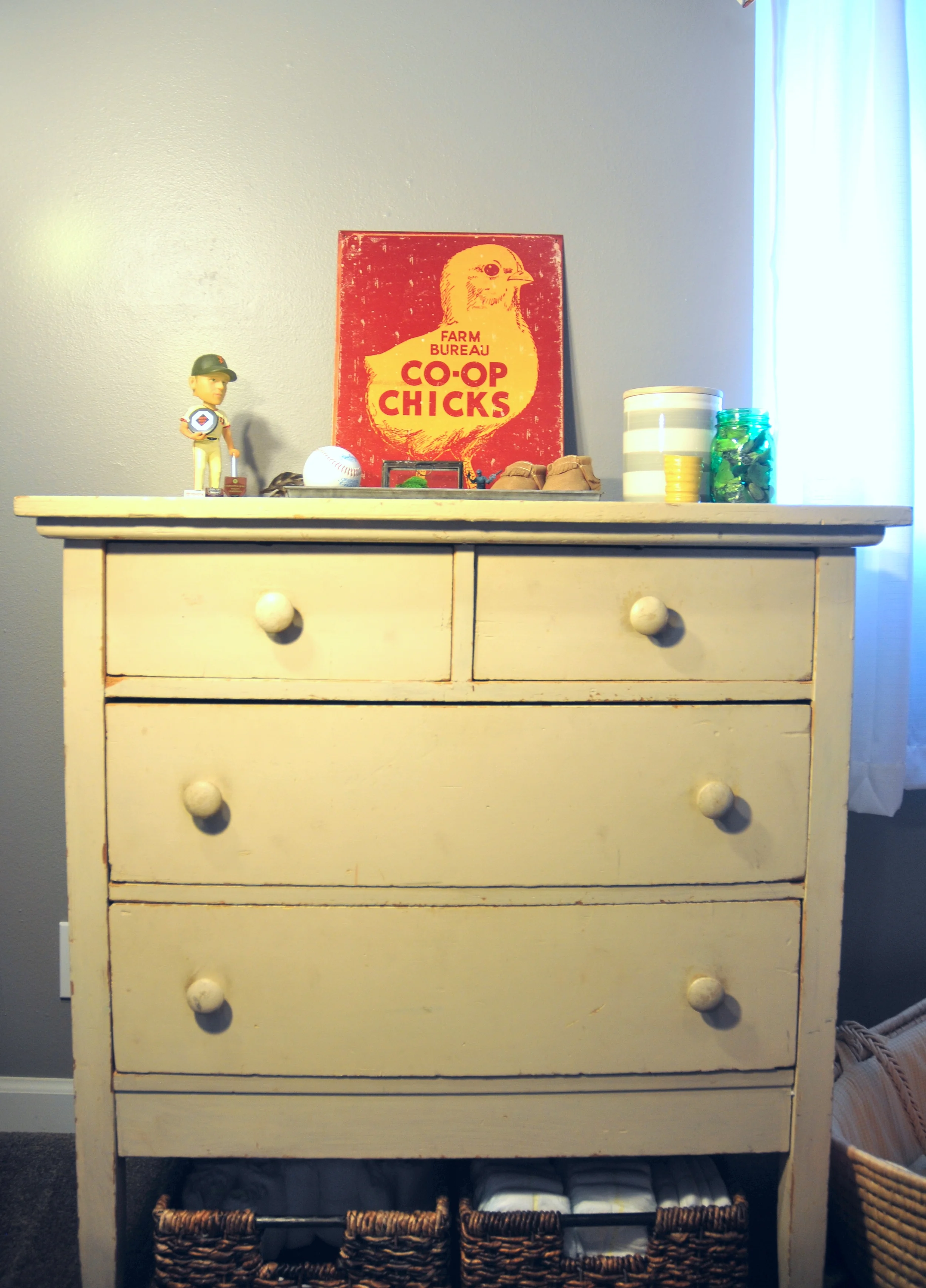 I went on a hunt for the perfect rustic dresser my brother was imagining and found this piece at an antique shop in Healdsburg. It fits perfectly in the space! I lined all the drawers with a simple patterned contact paper and added baby clothes organized by size.