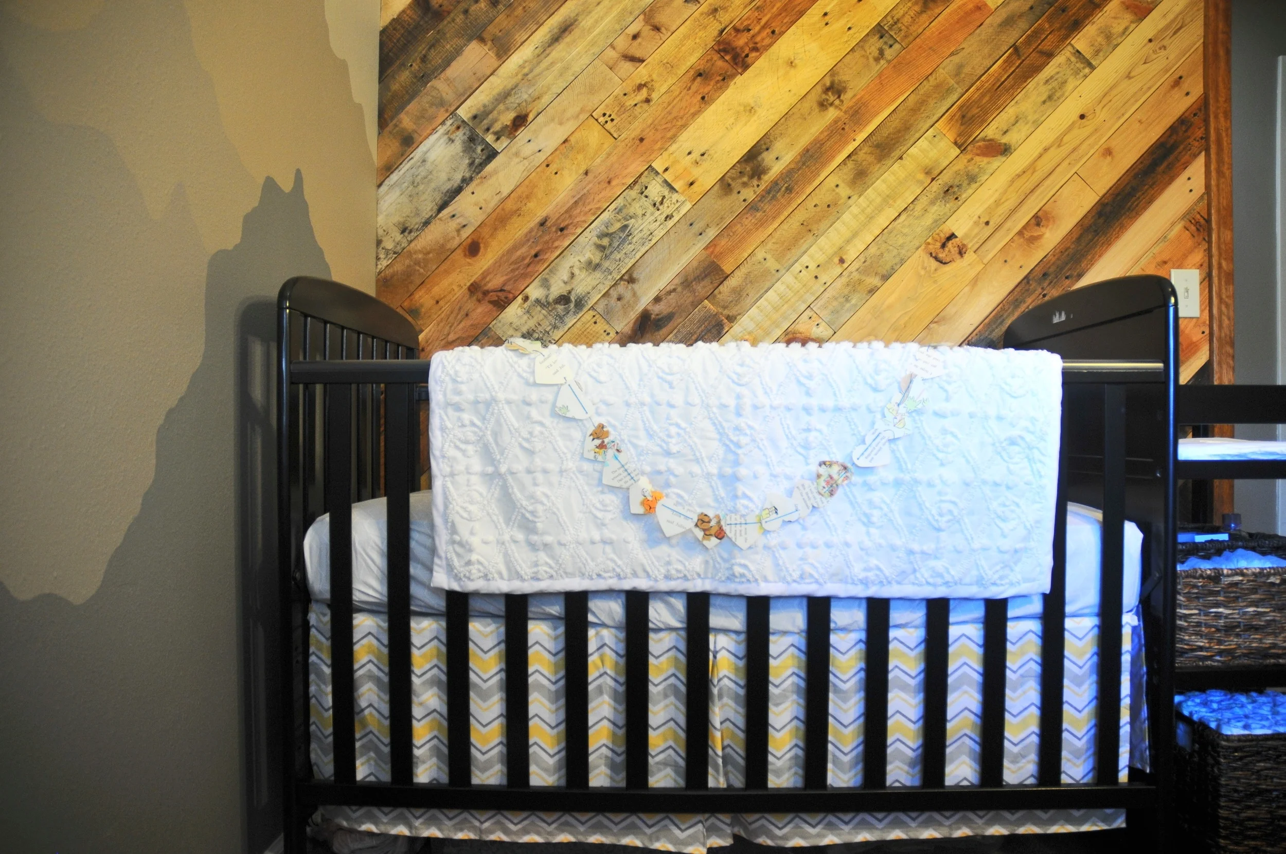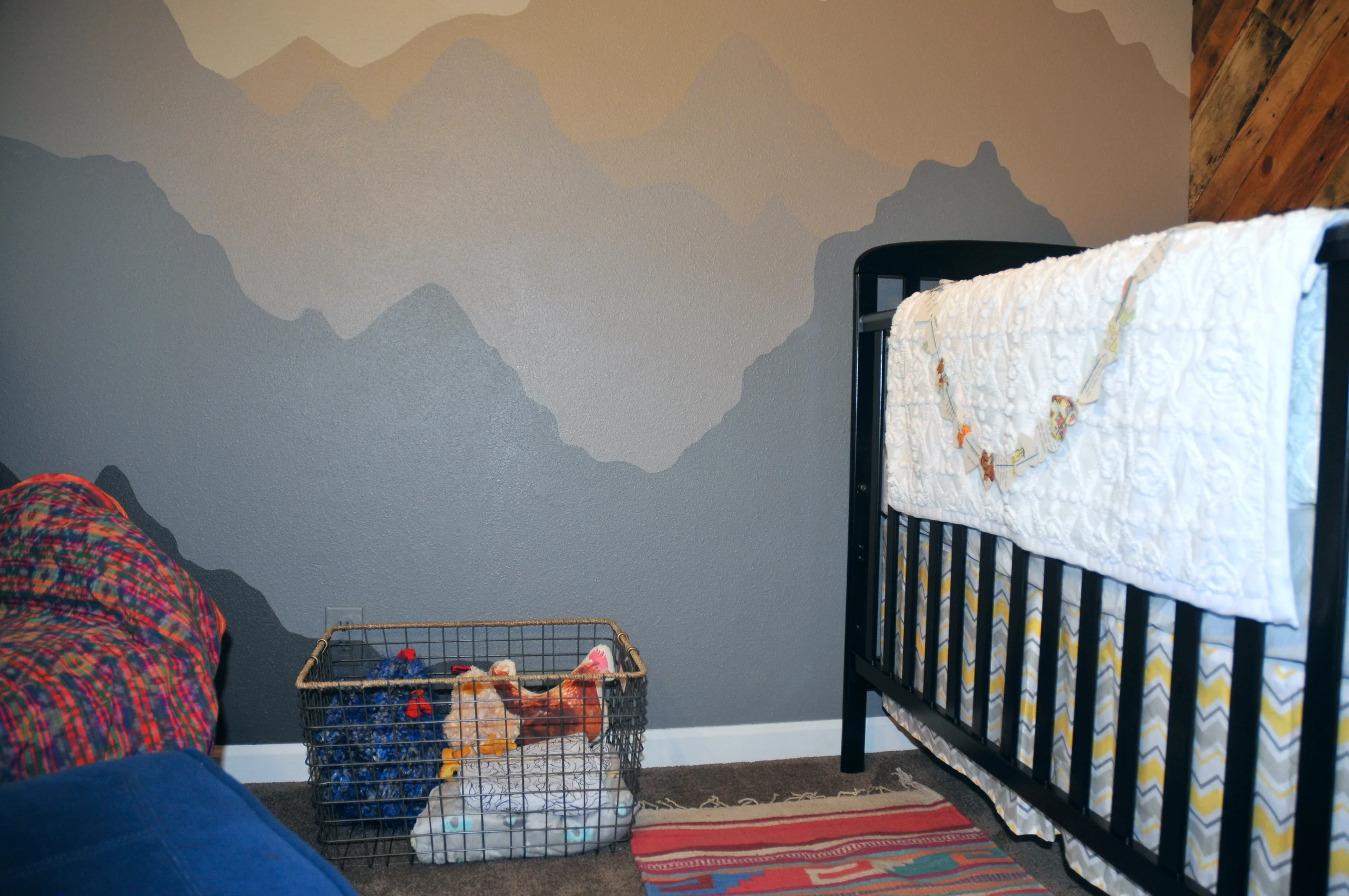 Ok so I can’t take any credit for the walls in Wyatt’s room. This is all my brother’s doing. He created that wood wall out of recycled pallets and then they painted the wall with the adorable mountain scenery. It's amazing right?