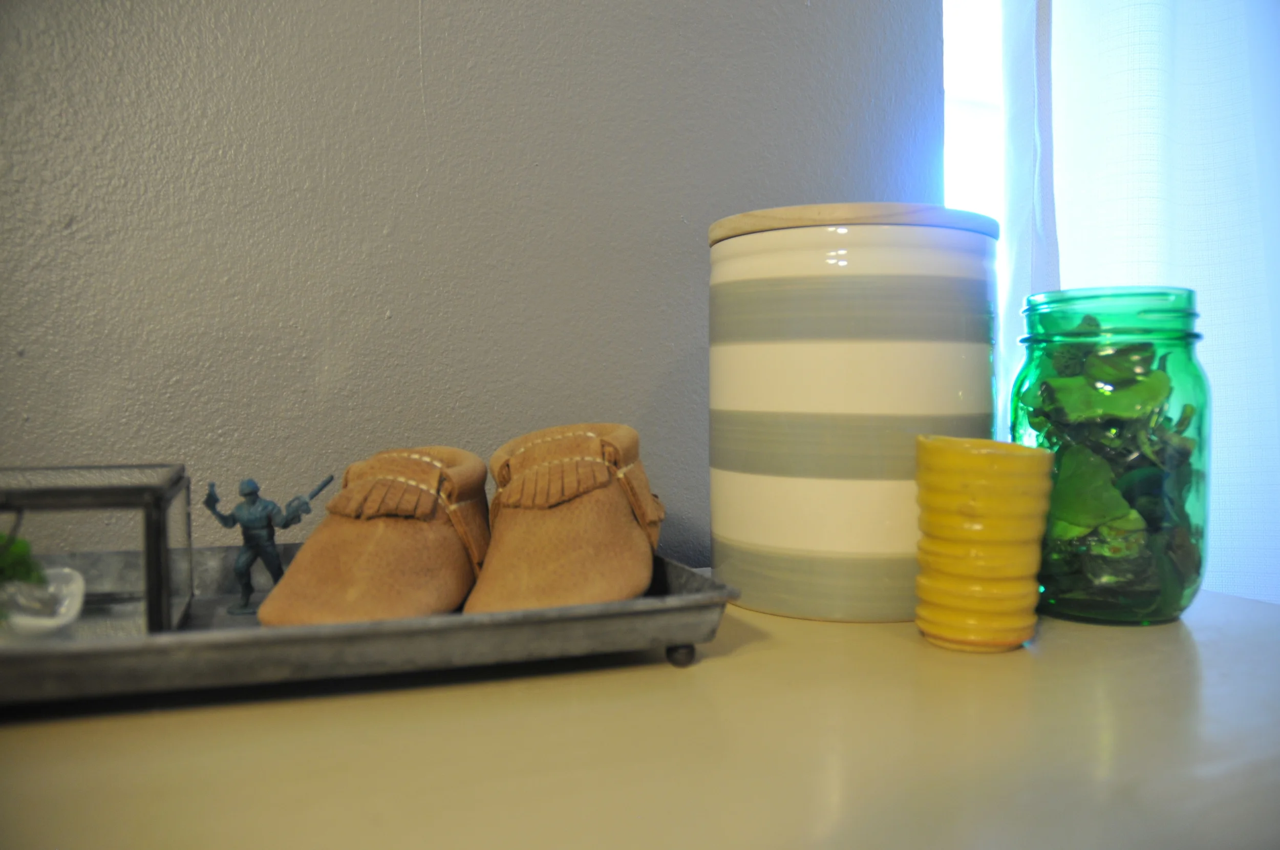 The existing built-in narrow shelf was perfect to hold adorable baby shoes!