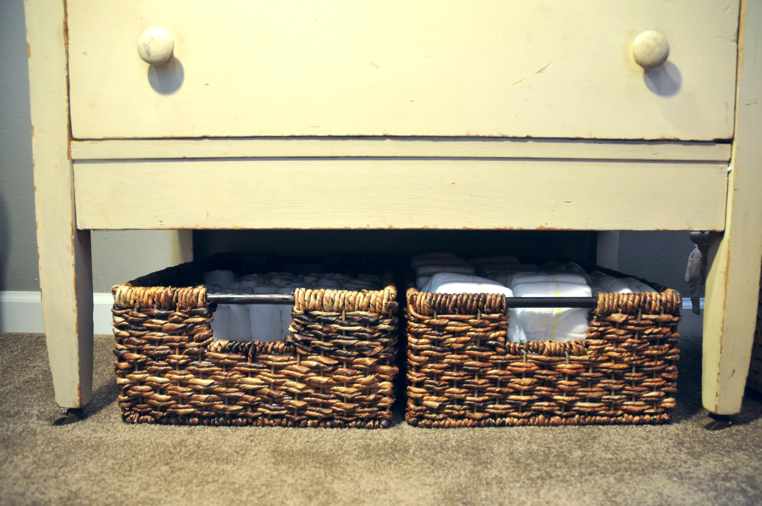 The space under the dresser allowed me to put 2 more shallow baskets for extra diapers.