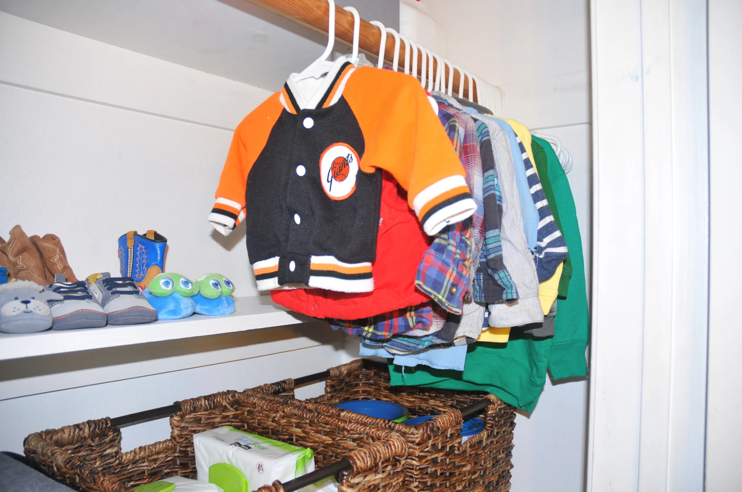 I also wanted to display some of Wyatt's San Fransisco Giants gear because I know how much that means to my brother. My brother (Nick) is the biggest SF Giants fan in the world. The retro baby Giants jacket was his jacket when he was a baby 34 years ago. I always thought my mom was crazy for keeping our baby clothes but this is such a special piece to have in baby Wyatt’s closet, it melts my heart.